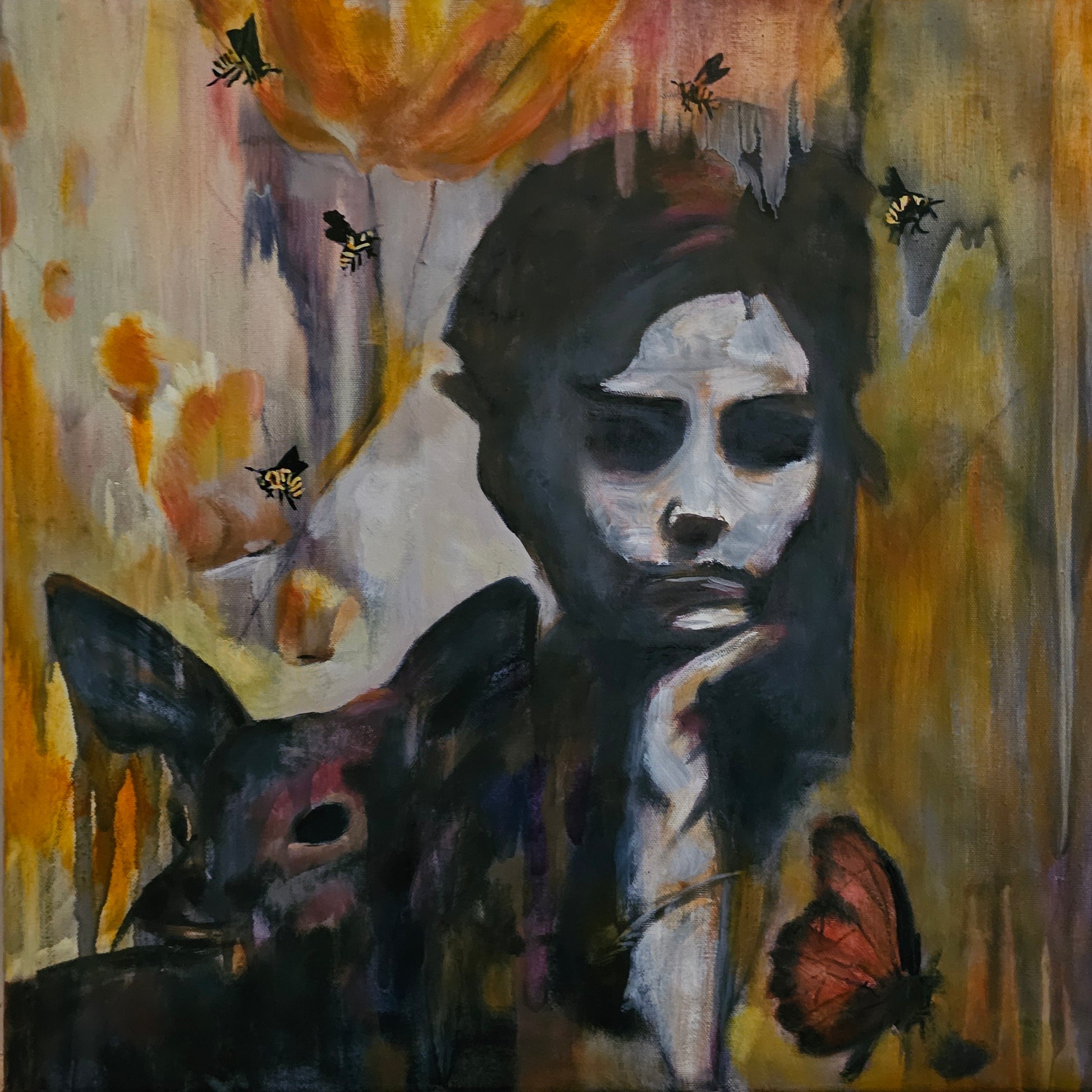 Surrounding her are careful studies of wildlife—a gentle fawn gazes directly at the viewer while bees drift through the honeyed air and butterflies add splashes of coral and crimson. These creatures aren't merely decorative; they serve as symbols of transformation, innocence, a totem and the delicate balance of ecosystems.