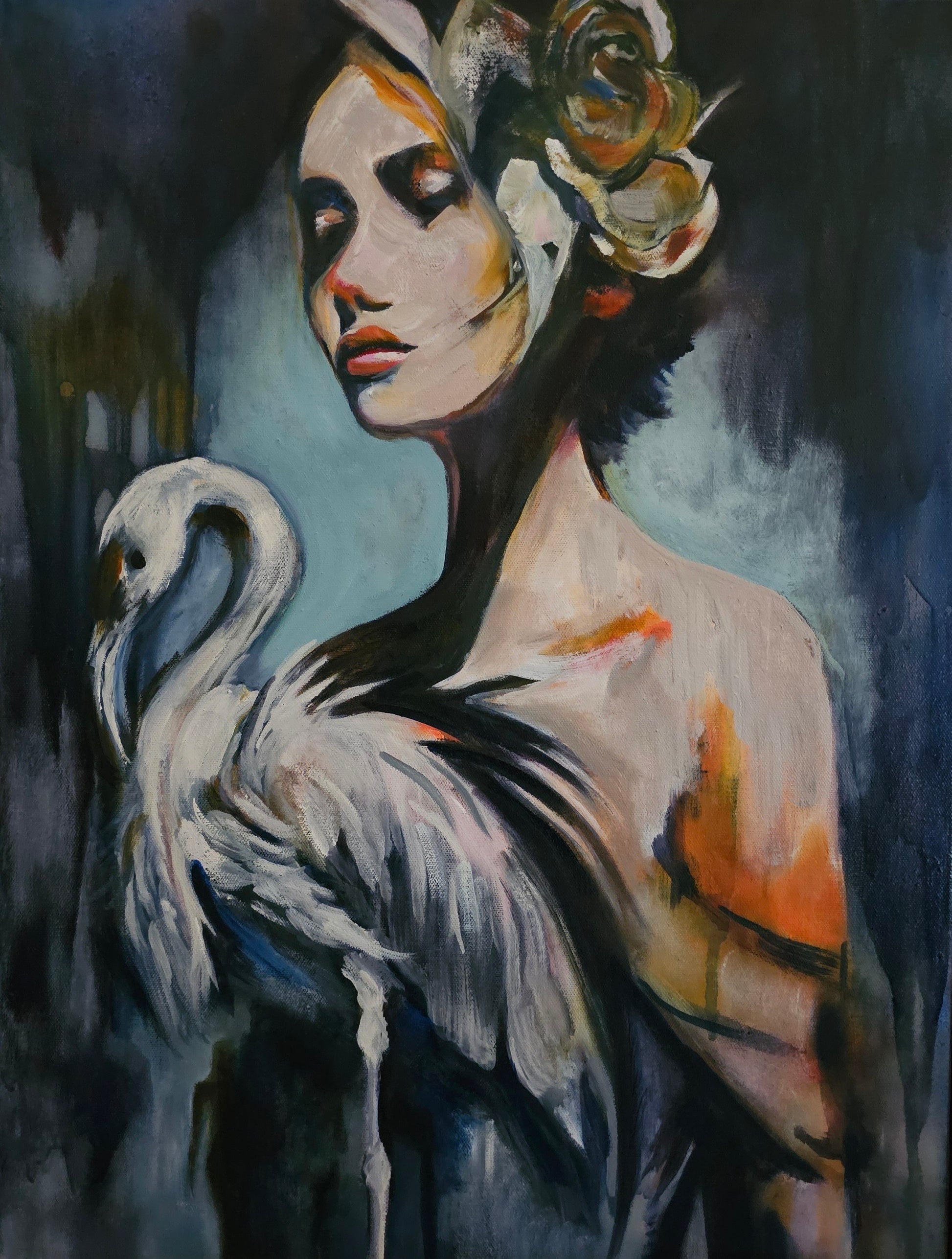 Cradled against her bare shoulder and chest rests an elegant white swan, its graceful neck curving protectively. The swan is painted with masterful attention to its plumage—sweeping brushstrokes capture the layered texture of feathers in whites, grays, and soft blacks. This intimate pairing speaks to ancient mythologies where swans symbolize transformation, purity, and the soul's journey.