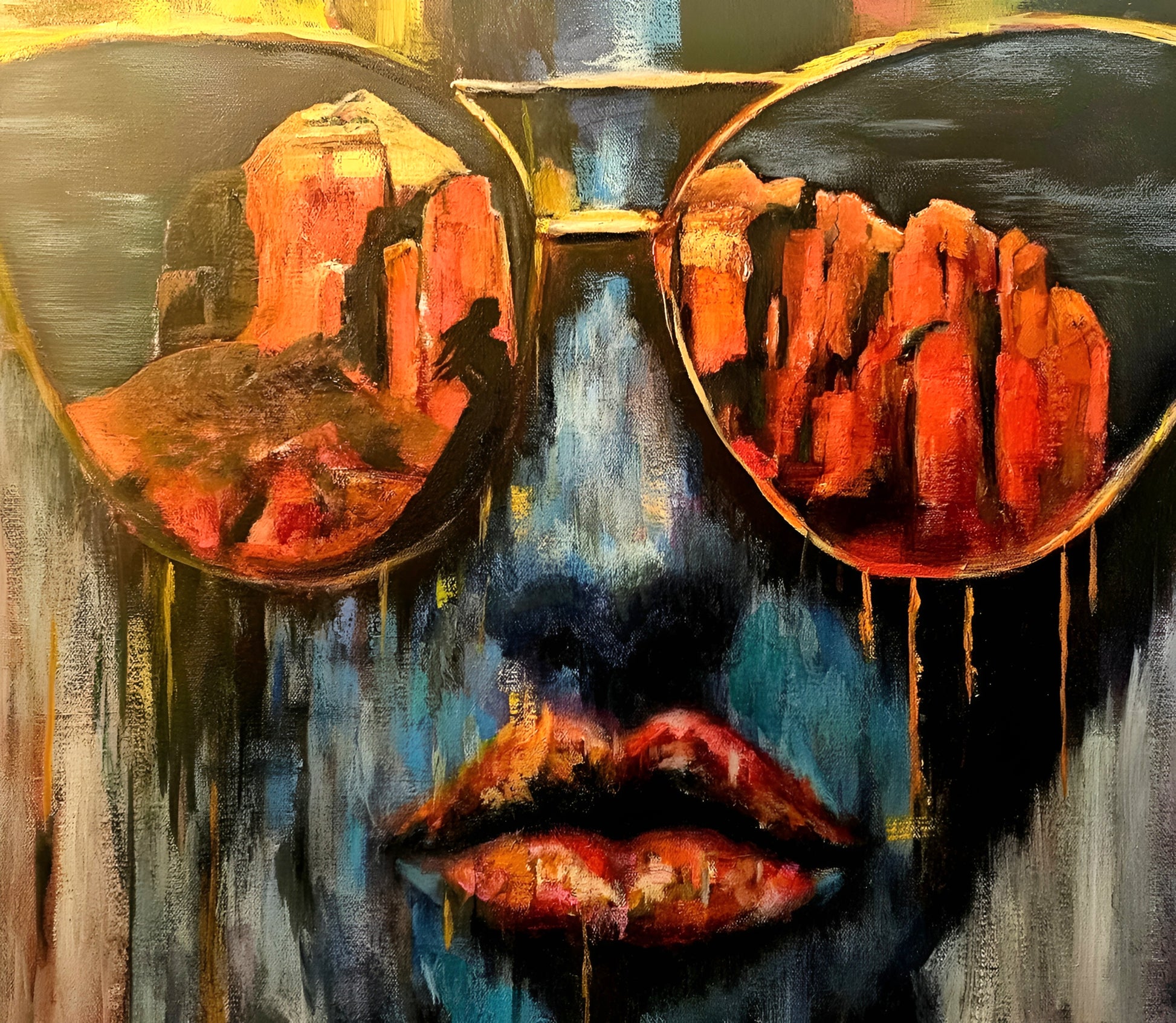 A face emerges from darkness, half-hidden, half-revealed—but what captures attention immediately are the oversized sunglasses that dominate her features. Within each lens burns the fiery orange and crimson glow of Sedona's legendary red rocks, as if she has absorbed the desert landscape so completely that it now colors everything she sees. Silhouetted figures walk through the canyons of her vision, tiny pilgrims traversing the sacred geology she carries behind her eyes.